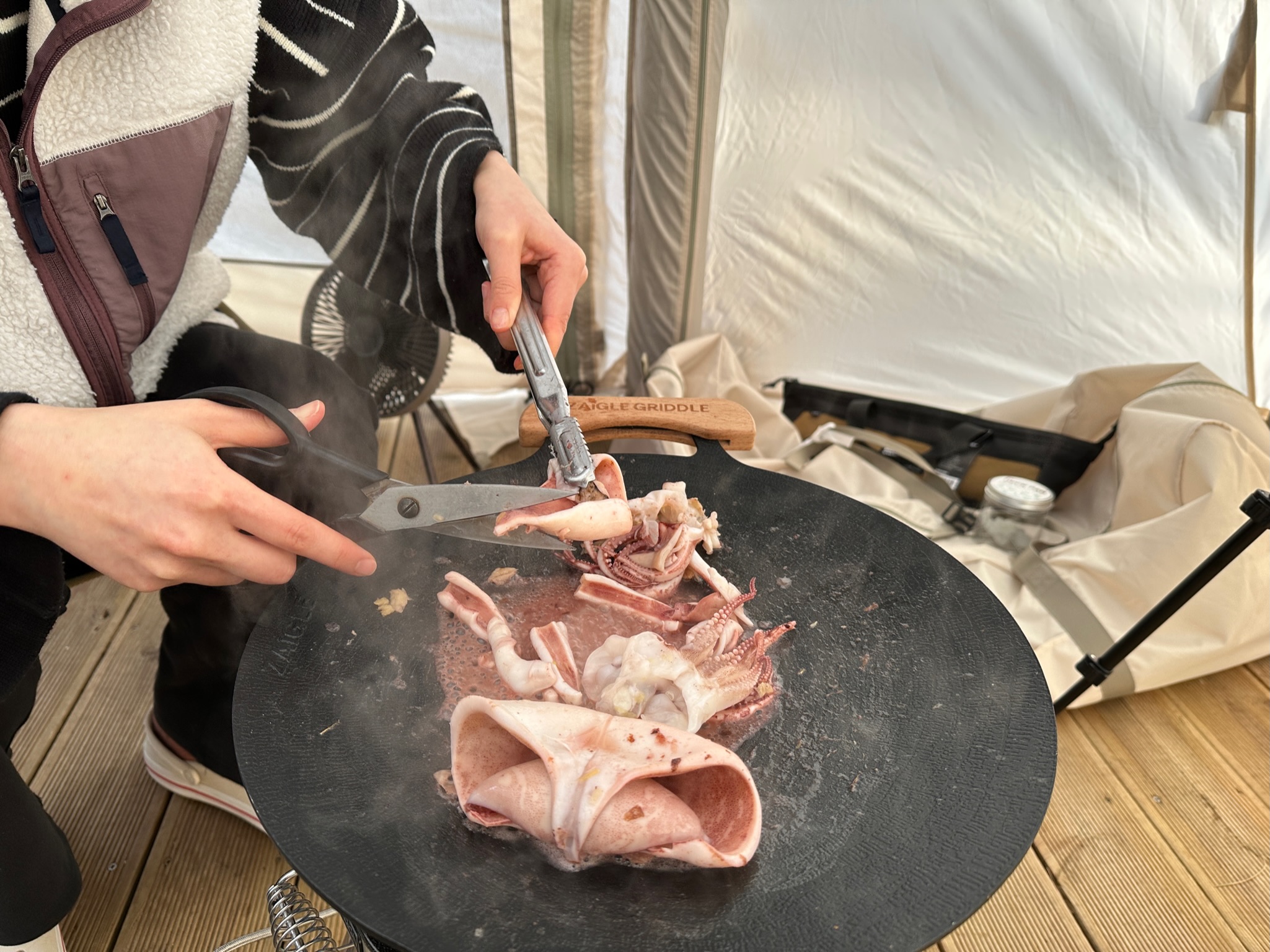 다시 휘게로 돌아와서 미리 양념을 해두었던 오징어를 굽굽 원래는 버터오징어였는데 버터를 집에 두고와서 있는 재료로 적당히 양념해서 구웠다. 그런데 넘넘 마싯자나.....